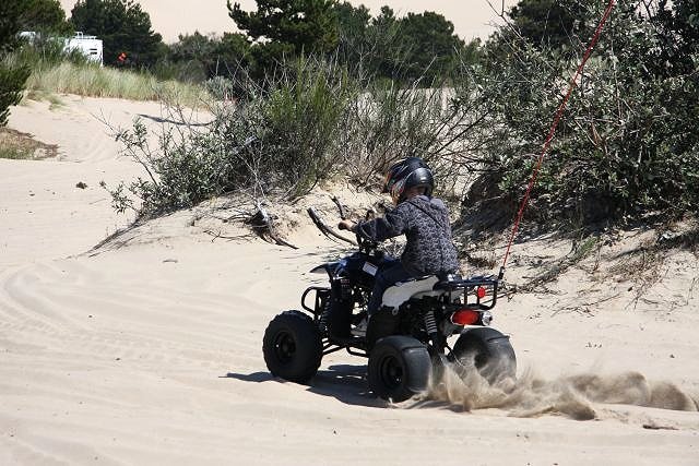 這是一位六歲的小男孩,在比較安全平緩的沙地騎著。
