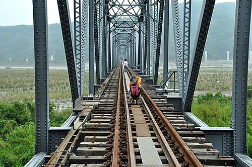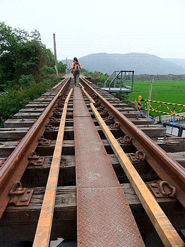 我們用雙腳感受氣勢攝人百年歷史的花樑鋼架鐵橋,俯視溪谷夾著兩側遠山山景。我拍下比恩卡Bianca 的身影,卻不知「螳螂捕蟬,黃雀在後。」我也變成 Axin 取景的好鏡頭。
