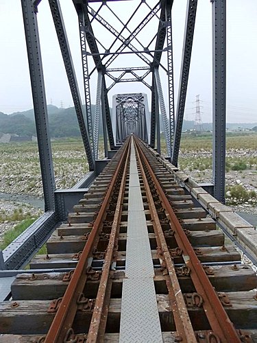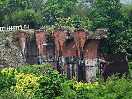 龍騰斷橋,紅磚砌成拱型,雖因地震損毀卻仍是鐵路藝術品藍天綠樹中散發殘缺之美,同時也訴說著歷史的故事。