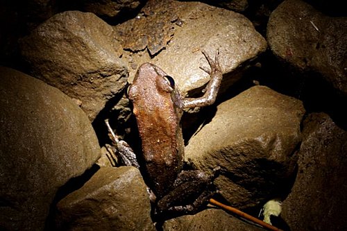 在隧道山洞裡,眼銳的我,看到跳呀跳呀的,是青蛙,同伴好心用頭燈照著,讓我拍下了這隻拉都希氏赤蛙,且牠是一雙雄蛙。青蛙王子可是我的最愛喔!也看到許多的蝙蝠。