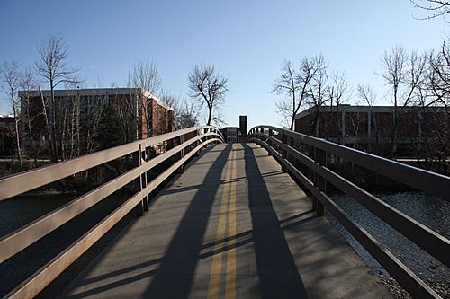 我漫步走到 Friendship Bridge,看到幾個 Boise 大學的學生在漫跑和玩飛盤。我有時會穿過這座橋從 BSU (Boise State University) 到 Julia Davis Park.。這座橋是 Boise River 的南北河岸的接連點。