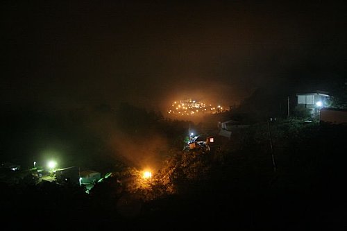 找了一家類似家庭果園休閒式的民宿,一人 600 元含早餐,就決定住下來了。雨愈來愈小,傍晚我們去附近的小徑走一走,由於天氣不是很好,但是仍不會影響我喜悅的心。我曾經說過:「不管晴天、陰天、雨天、甚至颱風天,心中永遠有晴天。」不是嗎?我們帶了自己的爐頭、瓦斯和鍋子煮麵條吃。民宿的主人很熱情的請我們吃他們自己種的玉米。晚上,我告訴Narcissus和Tory我想去拍夜景,因為我有帶腳架。走在黑暗山裡的柏油路上,吸著熟悉潮濕家鄉的空氣和仰望家鄉夜晚的天空,看看與德勒斯登Dresden有何不一樣?原來天空是一樣的,夜晚是一樣的,只是心情是不一樣的。而遠處山間部落的燈火,在黑暗裡,如同一盞盞的明燈,照亮了大地,讓大地有了一線的生機。