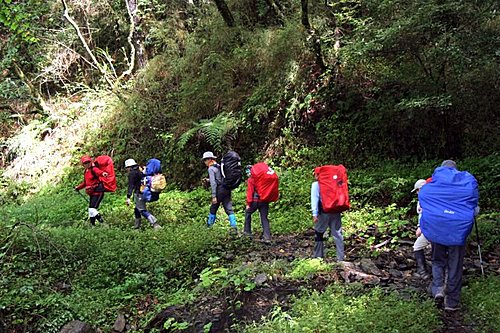 在林道裡,聽到遠處有人聲,原來是來自義大利的二位外國人士,來台灣工作,請台灣的朋友帶他們爬南湖大山,加上原住民挑夫共5人,爬了8天。而我們又遇到台北山岳會爬4天,以及野訊的登山團爬5天。回台灣來到台灣的山林裡,又遇到同是愛山人的同胞,心情真是喜悅不已。我的笑容一直掛在臉上,而其中義大利那團的一位登山人士,對我說:「你是這次南湖笑容最美的女人。」呵呵….不管聽起來是真話,還是謊言。聽起來還是很悅耳的,且是來自同是愛山人的口中。我自己臭美一下,就當作是真話吧!反正加減聽,也不會少一塊肉。