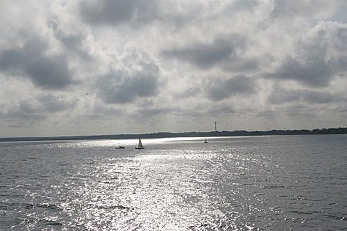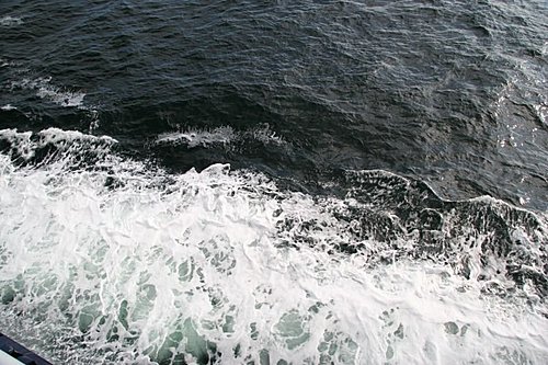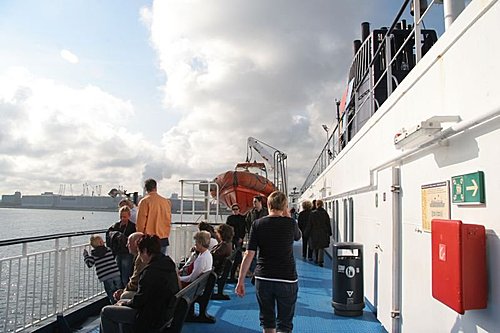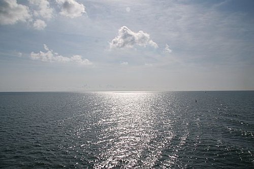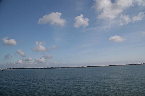 等待約半小時,所有的人全部進入自己的車子,車子緩緩駛進船艙,這艘輪船真是大,我爬上舺舨上,海風吹來,吹得很舒服,我一眼望向海的另一頭,無窮無盡。看海、看天、看早晨的陽光照著海面真是美,海天一色、海鷗飛翔,甚至美麗的浪花都讓這一天變成特別的美好,我相信以我愛探索和對每一件事物好奇的心,這趟的旅行一定會收穫滿滿!