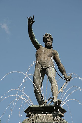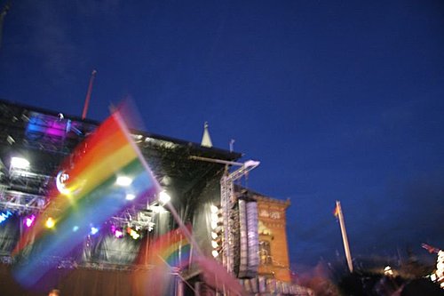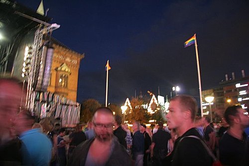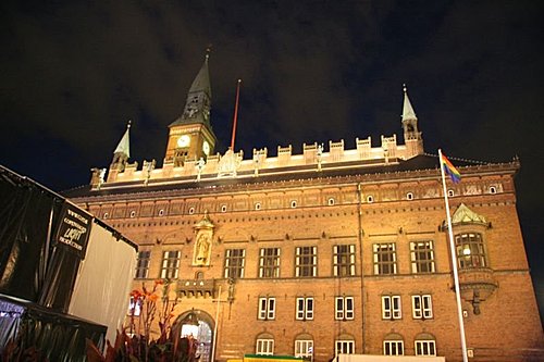 在運河旁有許多的街頭藝人表演著,和一群群觀光客、年輕人坐著欣賞這夕陽。飽足後,我們走到了中央車站的周邊去感受哥本哈根的夜晚是如何?我們來到市政廳廣場前,有露天舞台。呵呵..我怎能放過這呢?我一溜煙拿著相機跑入人群中,擠在載歌載舞男男女女的人群裡拍照。我發現不對,原來這是同性戀露天舞台。他們手拿著同性戀的六色彩虹旗揮舞著,我又擠出人群,看見 KG、Kevin、007 他們,我揮手示意他們擠進前面舞台裡。007 真的擠進來了,我們二個站在這群載歌載舞的人群裡,一對男同性情侶在我們面前接吻起來,而我右方前面的兩位女同性戀也接吻起來,而也有人跳舞跳到太瘋狂和投入,竟然一件一件衣服脫下,連最後的內褲也脫了,拿著內褲在手上飛舞著,真是太High了。其中有一位男性扮演女性的同性戀者,邀請我一起跳,我不知不覺身體隨著音樂舞動起來。當下的感覺,覺得自己好像是這場景的局外人。我雖然身體隨著音樂舞動著,但是我的頭腦是清楚的。因為我知道,我不會讓自己變成如此放縱自己,而自己真像這場景的旁觀者。我看了一下007,他在這人群當中,也真的像一尊木頭人,兩手交叉,真不知他的手和腳要擺在那裡才好,似乎手和腳都變成多餘的。我的眼光望向另一頭人群,我發現KG竟然也在人群中自己跳起舞來了。我在人群中拍了不少照片。也許他們的相愛是艱辛的,因為同性戀者真的只是愛上與自己同性的人而已,他們的情感是常常必須躲在黑暗的角落。任何人實在不能有任何的批判,因為情感的本身是沒有錯的。錯,只錯在上帝對他(她)開了一個玩笑。