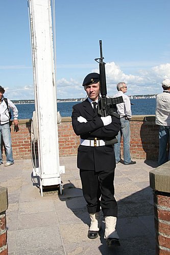 在這城堡裡,有一對新人結婚,新郎很帥,新娘也長得很美。心中默許著,「祝福這對幸福的新人,雖然我不認識你們」。我在城堡裡慢慢悠閒輕鬆的漫走、拍照。KG、Kevin 和007 也不知逛到那兒去了,不見他們的踪影。最後我看見了007,跟他一起上城堡觀景台。觀景台上排列著一列的戰炮,有軍士站崗和巡視著,我作了一個拍照的手勢,詢問是否可以拍他?他用眼睛眨眼表示OK。我歡欣若狂,連拍了不少,只是他巡視這觀景台時,必須保持同一的動作不變行走,真是辛苦他了。
