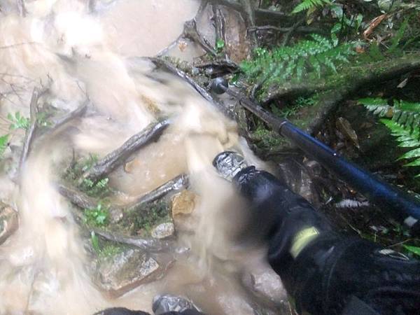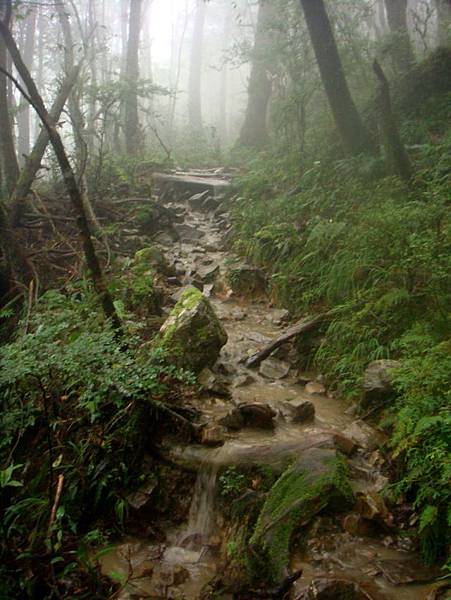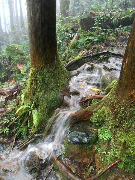 行走在樹根交錯的山徑步道上,雨水如同小溪流瀑布,踩著滿地的泥濘,是一種樂趣,也是一種享受,更是一種陶醉!我只能選擇「活在當下,且享受當下。」